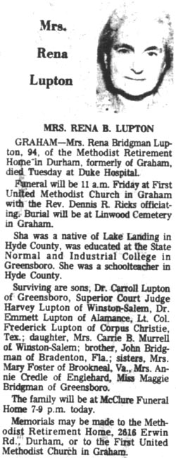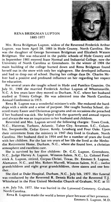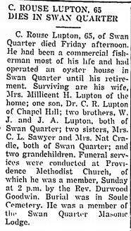 OUR SYMPATHY and LOVE is extended to the Family of Russell R. Lupton who died Friday in Greensboro. Russell was a member of Providence Church from childhood and had moved to the Greensboro area to be close to his guardian/cousin Sue L. Dudley. She was with him when he died in his doctor’s office. A celebration of Russell’s life was held on Sunday in the Family home in Swan Quarter. Burial followed in Soule Cemetery. Those wishing to send a card may address same to Sue L. and Bill Dudley, 4500 Gary Drive, Climax, N.C. (Soule Methodist Church newsletter dated Monday, February 14, 2011)