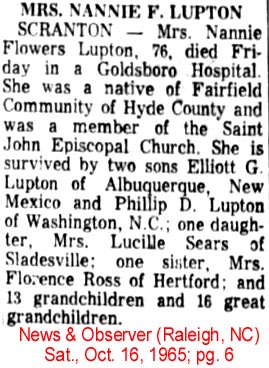 Margaret Lupton, a retired florist, teacher, and librarian, passed away on December 13, 2014, at the age of 101. The cause was pneumonia. She was born on November 12, 1913, in Swan Quarter, NC. Her parents were Urban Banus and Margaret “Maggie” McGowan Fisher. The Fisher and McGowan families recognized the value of education, and her parents took measures to ensure that their three children received higher education. After graduating from Swan Quarter High School in 1929, she entered East Carolina College (now East Carolina University) and graduated in 1933 with a degree in Science and English. After teaching elementary school in Nash County for two years, she returned to Hyde County and began teaching high school science and English in Swan Quarter. She and W. J. (Dick) Lupton married on March 7, 1936, and built their own home into which they moved in January 1939, even though the Great Depression wreaked havoc across the nation. They adopted their only child, Richard B. Lupton, in February 1944, and provided him with love and guidance throughout their lives. From them their son developed a deep love for family and Hyde County. A keen observer of beauty in general and flowers in particular, she recognized the need for a local florist, which resulted in the Margaret Lupton Florist, based in Swan Quarter. The business opened in 1951, and remained in her hands until 1968, when she sold it to Sallie Miller. In the 1970s she returned to East Carolina University and earned a library science certificate, and embarked on a second career as the librarian for Hyde County schools. She developed a passion for painting in the late 1960s, and used many Hyde County scenes, such as the Ocracoke lighthouse, the Swan Quarter harbor, and Lake Mattamuskeet, as subjects. She was a lifelong avid reader and an admirer of the works of Ayn Rand. New places, internationally and nationally, intrigued her, and over the years she had the occasion to travel to Canada, Europe, and various locations in the United States with her husband, family, and friends. Her husband preceded her in death in 1997, and, in order to be near her son in the last years of her life, she relocated from Swan Quarter to Columbus, Ohio, in the year 2000, where she was a blessing for him, his wife, and his children. During the years in Ohio she passed a wealth of family and county history along to Richard. Margaret Lupton is survived by her son Richard and his wife Linda Close Lupton of Westerville, Ohio; grandchildren Rhodes and Eleanor Lupton, both of Columbus, Ohio; a sister Rose Sharpe of Greensboro, NC; three grandchildren through Linda, Laura (Tim) Poland and Amanda (Drew) Briggs, both of Westerville, and Melinda DeBruyne of Beaverton, Oregon; four great grandchildren through Linda; four nieces and two nephews; and numerous great nieces and great nephews. She was loved and respected by all who knew her, and will be greatly missed. She was a rare individual, endowed with high intelligence and a natural concern for others, and will bear forever the statistical oddity of being born 11-12-13 and having passed away 12-13-14. A celebration of Margaret’s life will be held at Soule Cemetery, Swan Quarter, NC, on Saturday, December 20, 2014, at 2:00. In lieu of flowers, the family requests that donations be made to Providence Methodist Church in Swan Quarter or a preferred charity. (Bryan Funeral Service)LUPTON, Nannie Flowers