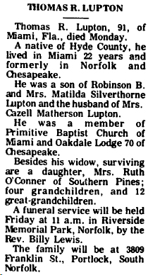 SWAN QUARTER - Robert R. LUPTON, 92, May 30. Funeral 11 a.m., Wednesday, Soule United Methodist Church. Burial, Soule Cemetery. Arrangements by Bryan Funeral Service. (The News Observer - Tuesday, June 1, 2004)