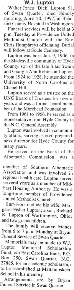 SWAN QUARTER - Walter Jones "Dick" LUPTON, 91, of Swan Quarter, died Sunday morning April 20 in Beaufort County Hospital in Washington. Born in the Sladesville community of Hyde County, January 9, 1906, he was the son of the late Silas Swain and Georgia Ann Robinson Lupton. He attended the University of North Carolina at Chapel Hill, 1924-28, served as a trustee for several years and was a former board member of the Morehead Foundation. He served for 6 years, 1961-66, as Representative from Hyde County in the N.C. General Assembly. He was active in community affairs serving as civil preparedness director for Hyde County for many years, served on the board of the Albemarle Commission, was a member of Southern Albemarle Association and was active in regional health care. He also served several years as a member of the Mid-East Housing Authority. He was a long time member of Providence United Methodist Church. Funeral services will be held at 3 p.m. Tuesday in Providence United Methodist Church. Rev. Chris Humphreys will officiate. Burial will follow in Soule Cemetery. Surviving are his wife, Mrs. Margaret Fisher Lupton; a son, Richard B. Lupton of Worthington, Ohio; and 2 grandchildren. Bryan Funeral Service is handling arrangements. (The Coastland Times - Tuesday, April 22, 1997; pg. 5A)