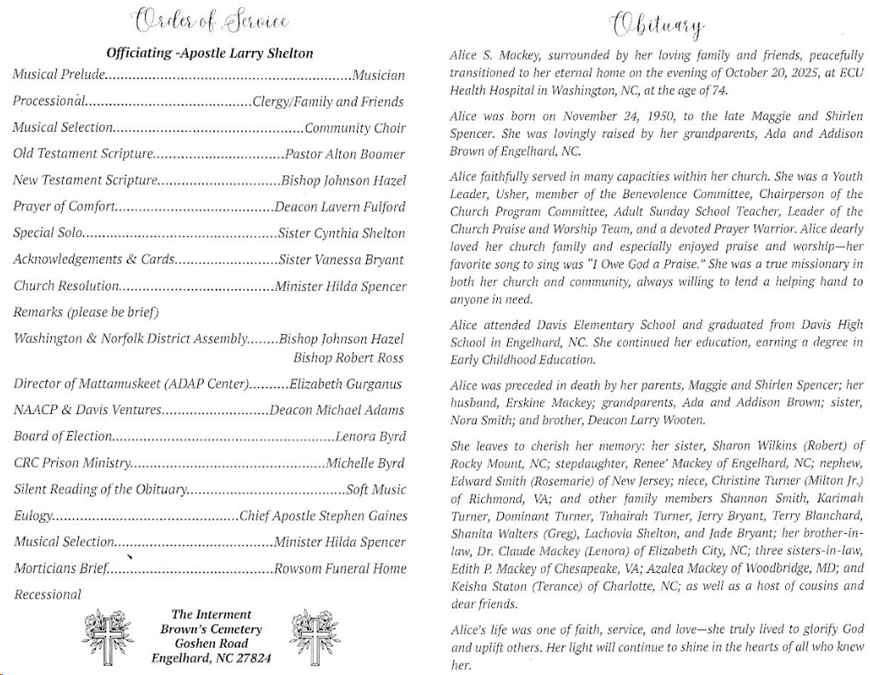 SWAN QUARTER - The sudden "homegoing" of Frances Taylor McCABE at age 56, has caused a great sadness. She knew the meaning of friendship and never counted the cost of loyalty. There are many in these surroundings who weep today for they have lost "The Best Friend They Ever Had". The Christian influence of the Taylor home was encouragement for her to join Saint John Church of Christ (Disciples of Christ) at an early age. She served faithfully in St. John Church as Secretary. She was employed with the Hyde County School System for twenty years and recently received her honorary emblem. Frances was united in Holy Matrimony to William Henry McCabe, Sr. who preceded her in death. On Wednesday, August 16, 2000 God reclaimed his own as our beloved Frances Taylor McCabe quietly and peacefully answered the Master's call to a place of peace and rest. Forever cherishing her memories are four daughters: Alma McCabe Beckwith (Jeffrey), Engelhard, NC, Marlene McCabe, Plymouth, NC, Linda McCabe of the home and Elsie McCabe, Greensboro, NC; two sons: Jerry Taylor of Hawaii and William McCabe Jr. of Mt. Olive, NC; nine grandchildren: Jerry Jr., Jamel, Lykari, Porcia, Briana, William III, Jasmine, Cherelle and Melanie, all of which she held dear to her heart; her mother, Laura H. Taylor, Belhaven, NC, three sisters: Sophia T. Bailey (Robert) Washington, NC, Laura E. Taylor, Englewood, NJ, and Agnes T. Henry, Scottsdale, AZ; three brothers: F. Randolph Taylor (Virginia), Timothy M. Taylor (Mary), all of Belhaven, NC and Edward M. Taylor of Washington, NC; three aunts: Ora Taylor, Maryland, Elsie Burrus, all of Washington, NC and Wilma Jones of Virginia; one uncle, Elder Calvin M. Hooker (Mae) of Baltimore, MD; three aunts-in-law: Goldie Hooker, Plymouth NC, Alice Slade and Judy Ebron (Elbert), of Swan Quarter, NC; eight sisters-in-law; three brothers-in-law; a host of loving nieces, nephews, cousins and friends. Homegoing Celebration was held on August 16, 2000 at Mattamuskeet School Gym, officiating Elder Andrew Boomer, Jr. and presiding minister, Anthony Roper. Interment was in the New Kingfield Cemetery, Ponzer Community, Belhaven NC. Service of Comfort entrusted to Whitfield & Whitley Funeral Home, 312 West Martin Luther King, Jr., Drive Washington, NC. (Washington Daily News - Saturday, August 19, 2000) [Kindly submitted by her children.]