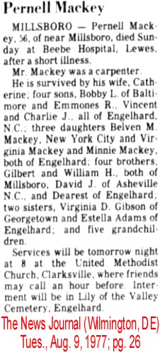 CHESAPEAKE, VA. - Murdock Dorset MASON, 95, of Weber Ave., died July 17. Born in Fairfield, he was the son of the late Zonnie and Annie O'Neal Mason. He was the widower of Mrs. Dorothy Jane Mason. He was a member of Gospel Hall of Chesapeake and retired from Norfolk & Western Railroad after 48 1/2 years service. Survivors include a son and his wife, Murdock L. and Lillian Mason of Chesapeake; a half-sister, Annie Willoughby of Creswell; a grandson and his wife, David M. and June Mason of Chesapeake; 4 step-grandchildren: Lillie Dvorak and Simon Aycock, both of Chesapeake, Joyce Gettier of Portsmouth, and Iris McMain of Yorktown, Va.; and a great-granddaughter, Katie Mason of Chesapeake. A graveside service was set for 11 a.m. Saturday in Riverside Memorial Park. Graham Funeral Home, South Norfolk Chapel, is handling arrangements. (The Coastland Times - Sunday, July 20, 1997; pg. 10A)