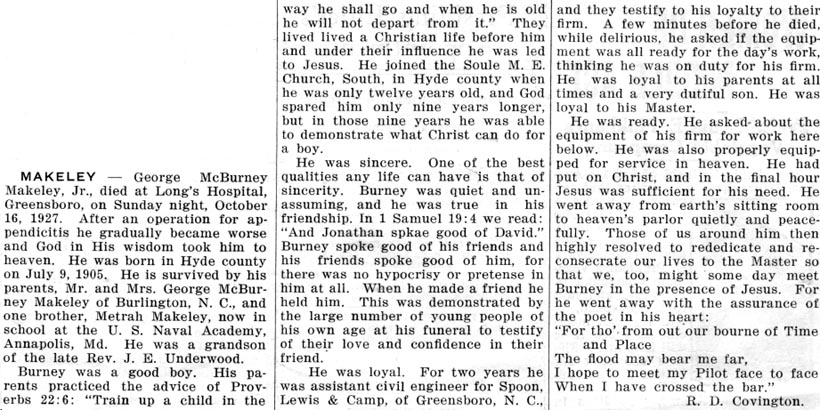 SALISBURY - James Alton McGOWAN, SR., 59, of 218 Mitchell Avenue, Salisbury, died this morning at 6:45 at the Rowan Memorial Hospital. He had been in declining health for five years but death was unexpected. A native of Swan Quarter, he was born November 17, 1908, son of the late Dorman Steele and Florida Helen Jarvis McGowan. He was an agent for Charlotte Liberty Mutual Insurance Co. and was owner of the Towne House Coffee Shop. He belonged to the First United Methodist Church. Survivors include his wife, Mrs. Mary Hooper McGowan, whom he married in 1938; three sons: James Alton McGowan, Jr. of Dallas, Texas, John Burney McGowan, a student at the University of North Carolina at Chapel Hill, and Dorman Jarvis McGowan, a student at Atlantic Christian College in Wilson; two daughters: Linda Sue (Mrs. James A.) McQueen of Chapel Hill and Mary Katheryn McGowan of the home; one brother, David Foy McGowan, Sr. of Chapel Hill; two sisters: Mildred Letha (Mrs. B. M.) Weston of Asheboro and Miss Metta Jarvis McGowan of Wilmington; and 2 grandchildren. Funeral services will be conducted Saturday at 2 p.m. at Sommersett Memorial Chapel by Dr. Ralph Taylor, pastor of the First United Methodist Church. Graveside services will be conducted Sunday at 3 p.m. at Soule Methodist Church Cemetery at Swan Quarter. The body will remain at the Sommersett Funeral Home until the funeral hour. The family will be at the funeral home from 7 until 9 o'clock tonight. The family requests that in lieu of flowers, memorial gifts be made to the scholarship fund of the First United Methodist Church. (The Salisbury Evening Post - Friday, Oct. 25, 1968)