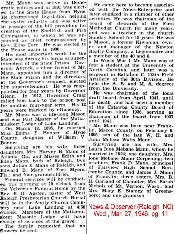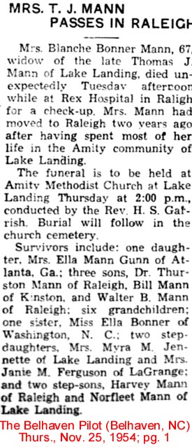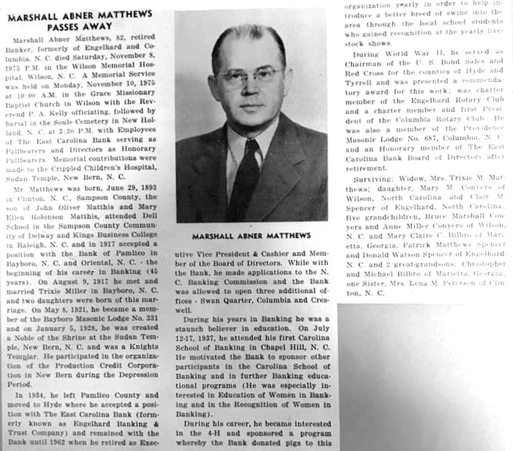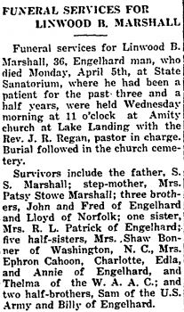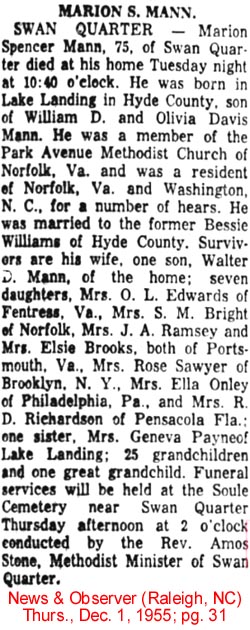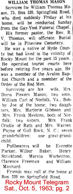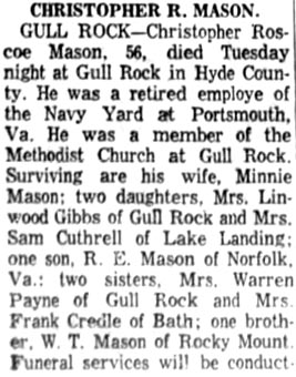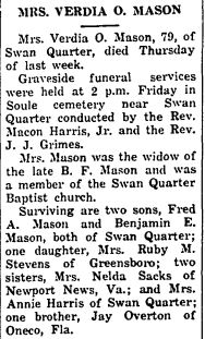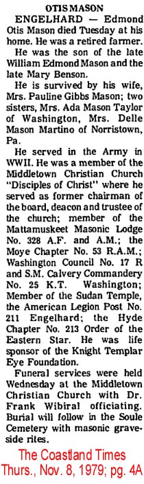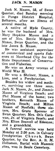Griffin Otis Mason, a resident of Tarboro for 22 years, died at his home at 912 Saint David St. on Tuesday night, December 30, 1958 at 10:10 of a heart attack. A son of the late Walterner and Bessie Howard Mason, he was born July 4, 1910. He was married to Miss Isabel Ange of Plymouth on June 14, 1940. His survivors are his wife and mother; one brother, Mack Mason of Scranton; one sister, Mrs. Margaret Mason Bridgman; three nieces: Joyce, Shirley and Gayle Bridgman of 1016 Indiana Ave. in Newport News, Va. He was a member of the Masonic Lodge, an Eastern State and a Grotto, a volunteer fireman of Tarboro and a member of the Missionary Baptist Church. Funeral services were conducted in Tarboro Thursday and the body was brought for burial to the Mt. Olive Church Cemetery in Ponzer. Acting pallbearers here were members of the Atlantic Masonic Lodge of Swan Quarter and the service completed at the grave by Owen Emanuel, the new minister in Hyde County. (The Coastland Times - Friday, January 9, 1959; pg. 5)