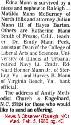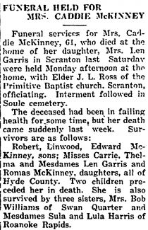 CHESAPEAKE, VA - Ava Myrl McKINNEY, 70 of the 1200 block of Elder Ave, Chesapeake, died April 22 1986, in her home. Mrs. McKinney, a native of Scranton, Hyde Co., NC , she was the daughter of the late Lemuel C. McKinney and Carrie Virginia Hudson McKinney, and was a member of Primitive Baptist Church, Norfolk, VA. Survivors include her husband, Romulus Oscar McKinney; a daughter, Barbara Ann McKinney Peck of Chesapeake; four sons: Wilbur R. McKinney of Roanoke Rapids, NC, Gene McKinney of Virginia Beach, VA, Roger C. McKinney and Ronnie A. McKinney, both of Chesapeake; a sister, Thelma McKinney Baker of Lanha, MD; 15 grandchildren; and 15 great-grandchildren. The funeral was conducted at 3:30 PM Friday in Primitive Baptist Church, Norfolk, by Elder Joseph Leggett. Burial was in Chesapeake Memorial Gardens, Chesapeake, VA. The family was at Gay & Oman Funeral Home, Great Bridge Chapel, from 7 to 8 Pm Friday. (The Virginian Pilot - April 23, 1986) [Submitted by Morris McKinney]
