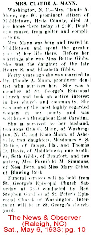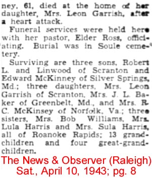CHESAPEAKE, VA. - Iola Gibbs McKINNEY, 96, of South Lake Circle, died Friday, March 1, 1996, in a Chesapeake Nursing Center. Mrs. McKinney was born in Engelhard, N.C. and was the daughter of the late Syle B. and Louise Midgett Gibbs. She was the widow of Robert Darrell McKinney and was a member of Great Bridge Church of Christ in Chesapeake. Survivors include her two daughters: Shirley Decker of Norfolk and Delma Smith of Chesapeake; two sons: Horace McKinney of Powells Point, N.C. and Bobby McKinney of California; two sisters: Rosa Toler of Wanchese, N.C. and Mollie Gibbs of Edenton; a brother, John Gibbs of Chesapeake; 8 grandchildren and 10 great-grandchildren. A memorial service will be conducted at 7:30 p.m. Monday in the chapel of Oman Funeral Home in Great Bridge. There will be no public viewing or visitation. Burial will be private in Engelhard Cemetery in North Carolina. (The Virginian- Pilot - March 3, 1996; pg. B6) [Submitted by Ann Byrnes LaDue of Virginia Beach, Va.]