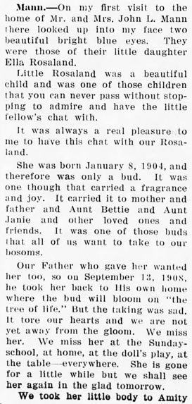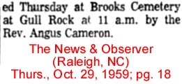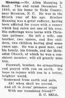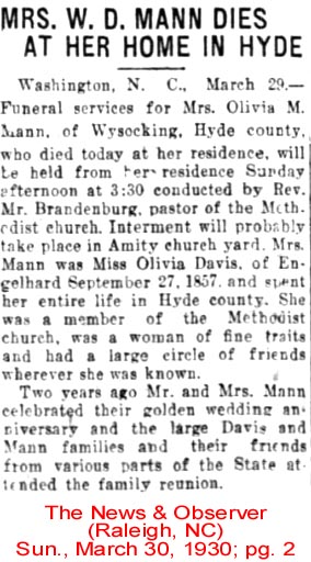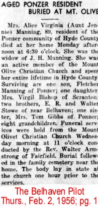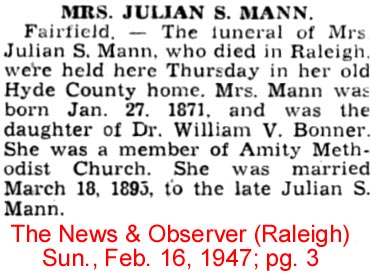 WASHINGTON, N. C. - Mrs. Melissa O’Neal Mason, 84, a former resident of the Sladesville Community of Hyde County, died Sunday at the home of her daughter, Mrs. John B. Sadler. She was the widow of John B. Mason. She was a member of Eunice Chapel Church of Christ. She had been making her home in Norfolk, Va., for the past 13 years. Survivors are two daughters, Mrs. John B. Sadler of Norfolk, Va., Mrs. Dollie Dillon of Scranton. Funeral services will be held at the Eunice Chapel Church of Christ, Sladesville, Tuesday at 2 p.m. by the Rev. W. P. Armstrong. Burial will be in the family cemetery. (The News and Observer, Raleigh, N.C., Tuesday, Jan. 20, 1959, Pg. 15)