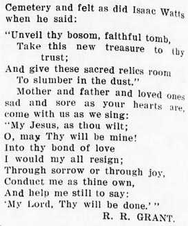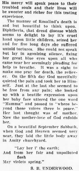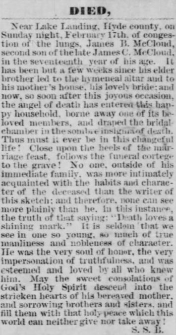 From Hyde County - Mr. McCLAUD died and was buried at St. George's on the 19th. Services conducted by Rev. Mr. Thorp, assisted by Rev. M. Barber. Attendance was large, 125 persons or more. (The Washington Gazette - Thursday, February 28, 1884; pg. 3; column 5) [Posted here with kind permission from John H. Oden, III] In Memory Of states James Custus McClaud, Jr. was born November 25, 1867 and died February 17, 1884. His parents are listed as James Custus McClaud, Sr. and Mary Jane Swindell.