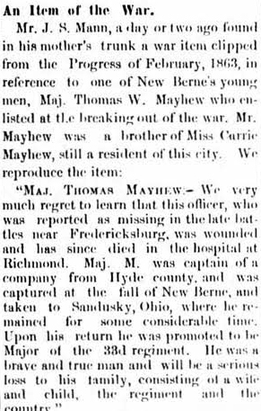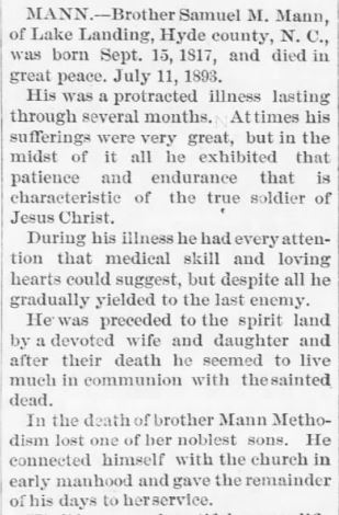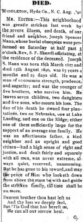 Mr. Jesse S. Mason, who was favorably known throughout the county and in the lower part of Beaufort, as a mason by occupation, died at his home on Rose Bay on the night of 28th of April. (Washington Progress, Tuesday, May 13, 1890) [Submitted by Linda Mayo who adds: Father: Dorset Mason; mother: Catherine _____; married Clarissa Cutrell. In the census of 1860, the occupation of Dorset and Jesse was that of Master Mason.]