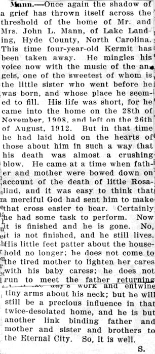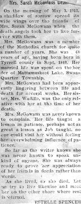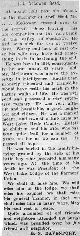 SWAN QUARTER - Funeral services for H. L. McGOWAN [Henry Lawrence McGowan, son of William & Rebecca Davis McGowan], one of the oldest citizens of Hyde County and former superintendent of public instruction and teacher in the schools of the county, will be held Friday morning at 10 o'clock at Sould [Soule] Methodist Church. The Rev. R.Z. Newton of Swan Quarter will conduct the services. Burial will be in Sould [sic] Cemetery. Mr. McGowan was 85 years old. He was born, reared and spent all of his life in Hyde County and lived near Swan Quarter. In recent years before his health failed, he had been engaged in farming. He was a member of the Methodist Church and was well known in this section. He died Wednesday night after an illness of three years (at his Hyde County home). Death was caused by angina and the infirmities of age. Surviving are his wife, who before marriage was Miss Effie Stotesbury of Hyde, and the following children: W.T. [William Tilman] McGowan of Timmonsville, S.C., J. [John] Herbert McGowan, Mrs. U.B. [Margaret Rebecca] Fisher, Mrs. Viola Cahoon of Swan Quarter and Mrs. Curtis [Beulah Dell] Crossman of Macon. [The name "Effie" is in error here. Her name was Gildeppie "Deppie" Dell Stotesbury.] (News & Observer, Raleigh - Friday, July 14, 1938)