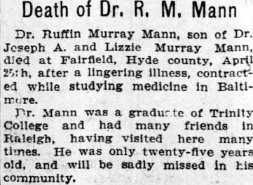 Mr. McCARTHY (no first name given), the genial Irishman, drowned at Makleyville in Hyde County on Thursday last. (The Washington Gazette - Thursday, August 2, 1894; pg. 3; column 2) [Posted here with kind permission from John H. Oden, III]