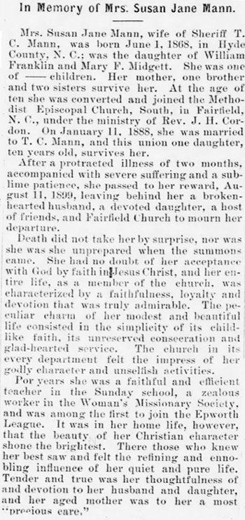 SWAN QUARTER - Elizabeth Midgette MASON, 96, died Dec. 16, 1991, in a nursing home. Mrs. Mason was born in Hyde County. She was the widow of Jones Spencer Mason and was a member of Calvary Presbyterian Church, Swan Quarter. Survivors include two daughters, Margaret M. Spencer of Swan Quarter and Clara M. Boswell of Edenton; two sons, Kenneth R. Mason of Chesapeake and A. Milton Mason of Norfolk; 14 grandchildren, 17 great-grandchildren and 3 great-great-grandchildren. The funeral will be at 2:30 p.m. Wednesday in Calvary Presbyterian Church. Burial will be in the M.F. Mason family cemetery, Swan Quarter. Bryan Funeral Home, Swan Quarter, is handling arrangements. (Virginian-Pilot - Tuesday, December 17, 1991; pg. 2D)