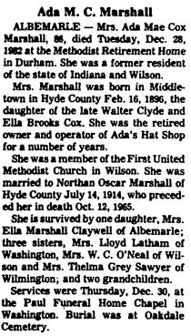 NEBRASKA - Rachel Baum Dudley Marshall McGRATH, 82, of Charles Drive in Kinston, and formerly of the Nebraska community of Hyde County, died Saturday, April 20, at Lenoir County Memorial Hospital. Born in Hyde County on February 25, 1914, she was the daughter of the late William Jacob and Farrow Mae Smith Baum. She was a member of Watson's Chapel United Methodist Church and was long active in the United Methodist Women's Work. She was also a member of the Nebraska Home Demonstration Club. Mrs. McGrath was first married to William Swindell Dudley, Jr. who died in June 1961. She later married William Guy Marshall who died in September 1968, and was last married to Hammond William McGrath, who died in August 1974. Surviving are a son, William S. Dudley, III of Climax; three daughters: Larue D. Cunningham of West Columbia, S.C., Mary D. Cederdahl of LaMesa, California, and Ann D. Grant of Kinston; 10 grandchildren and 3 great-grandchildren. A memorial service was held at 11 a.m. Monday at Watson's Chapel United Methodist Church in the Nebraska community. The Rev. L.R. Sparrow and the Rev. Edith Dudley Jenkins officiated. Private burial services followed in Fairfield Cemetery. Arrangements were made by Bryan Funeral Service in Swan Quarter. (The Coastland Times - Tuesday, April 23, 1996; pg. 10A)