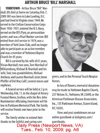 Kenneth Russell Mason, Sr., a man who loved family, friends, and laughter and who spread laughter wherever he went, died on February 1, 2015. Kenneth was born in Swan Quarter, N. C. to Jones and Elizabeth Midgette Mason on February 17, 1922. At 17, he joined the Civilian Conservation Corps and served at Camp Virginia Dare in Manteo, N. C. for 15 months. At 18, he joined the U. S. Navy where he served honorably for 20 years serving in both the Atlantic and Pacific Theaters during World War II. His service included combat in the Pacific on his favorite ship, the USS San Juan. Following his Navy service, he was a Civil Service employee working as a master meat cutter at the Little Creek Commissary in Virginia for 14 years. After retirement, he “worked on the water” in Swan Quarter. “I always had a good time”, Kenneth often said, and he made others have a good time too. Kenneth was preceded in death by his parents; his beloved wife of 59 years, Dolores Gibbs; two brothers, Jack and Milton; three sisters, Margaret, Dorothy and Clara. He is survived by son, Rusty Mason and his wife, Joyce of The Villages, FL; his daughter, Tonia Pridgen and husband Jesse of Raleigh; grandson, Lott Mason and his wife, June; and great-grandchildren Haden and Miles Mason, San Clemente CA. A memorial service for Kenneth Mason will be held at 11:30 a.m. on Wednesday, February 4th at Calvary Presbyterian Church in Swan Quarter, N.C. Visitation will follow the service at the Senior Center on Quarter Road. The family will have a service at a later date at Arlington National Cemetery where both his ashes and those of his wife will be placed in the columbarium there. Appreciation from the family goes to Transition Life Care of Wake County, Morningside Assisted Living, and the fifth floor staff at Rex Hospital. (The News & Observer - Tuesday, Feb. 3, 2015)