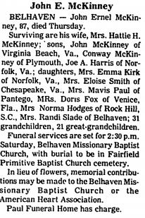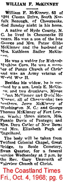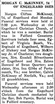 CHESAPEAKE, VA - Ellis Latham McKinney, 79, of 2726 Great Bridge Blvd., died Sunday, June 14, 1964 at 9:00 AM in a Norfolk, Va. Hospital. A native of Lake Landing Township, Hyde Co., N.C., he was the son of the late Robert Clifton McKinney and Martha Lucas (Patsy) Gibbs McKinney of Hyde Co., N.C. and husband of Pearl Lee Spencer McKinney of Chesapeake, Va. He was a member of Broadmoor Church of Christ. Besides his wife, he is survived by a daughter, Roma Hilda McKinney Williams of Chesapeake, Va.; three sons Romulus Oscar McKinney and his wife Ava Merle McKinney McKinney of Chesapeake, Va., Harold Ellis McKinney of Louisville, Ky., and Grafton Odette McKinney and wife Mildred Weatherly McKinney of Portsmouth, Va.; a sister Ina Virginia McKinney Gibbs of Portsmouth, Va.; two brothers, Calvin Bishop McKinney of Norfolk, Va., and Morgan Clifton McKinney of Engelhard, Hyde Co., N.C.; 17 grandchildren and 19 great-grandchildren. A funeral service was held Tuesday at 2:00 p.m. in Francis Gay Funeral Home by the Rev. James A. Cooper. Burial was in Olive Branch Cemetery, Portsmouth, Va. (The Virginian-Pilot; Monday, June 15, 1964) [Submitted by Morris McKinney]