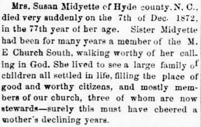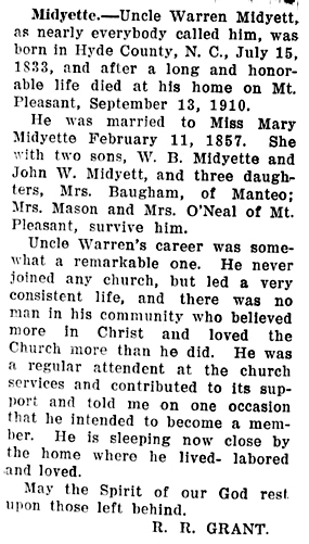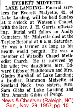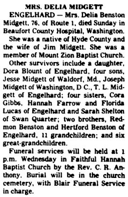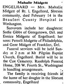 Rev. Harvey MIDGETTE, son of the late Mr. & Mrs. A. Midgette was born August 19, 1908 in Hyde County. He was called from labor to reward Sunday, June 18, 1978 at the Beaufort County Hospital in Washington, NC. He was married to Hilda Slade and to this union was born 9 children. [Hyde Co. marriage records state that Harvey Midyette, age 21, married Hilden Slade, age 20, on May 11, 1933.] At a very early age he was called to the Ministry and remained in this position until death. He was pastoring Old Richmond Missionary Baptist Church & St. Lydia Baptist Church in Swan Quarter, NC., St. Union Missionary Baptist Church & Clay Bottom Missionary Baptist Church in Chocowinity, NC. He leaves to mourn, his wife Mrs. Hilda Midgette of the home, four sons, Mr. Harvey Midgette Jr., of Florida, Mr. Willie Midgette of Belhaven, NC., Mr. Oscar Midgette & Samuel Midgette of NY., three daughters, Mrs. Annie Blackmon of Charlotte, NC., Mrs. Ella Phillips & Mrs. Bettie Midgette of NY. He is preceeded in death by two daughters Gloria Mae Midgette and Hilda Midgette. He leaves 13 grandchildren, three daughter-in-laws, two son-in-laws, and a host of other relatives and friends. (unknown newspaper - Kindly submitted by his granddaughter, Yolanda Midgette Blackmon)