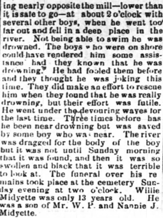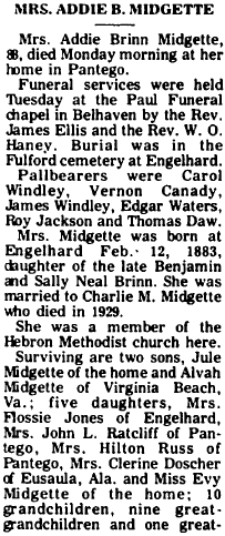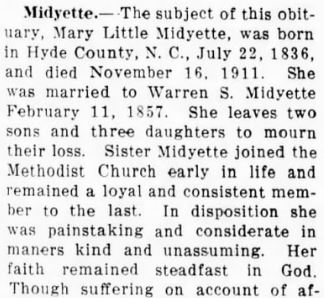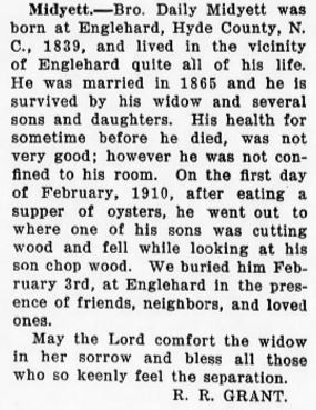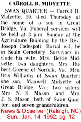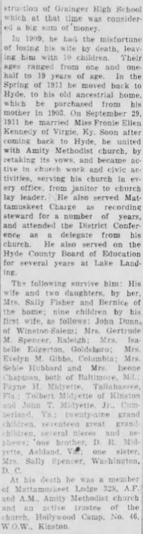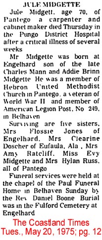 BELHAVEN - William J. Midgett of Belhaven, and employee of the NBC boatline of Norfolk and Baltimore, died Saturday night in the U.S. Naval Hostpial at Charleston, S.C. He was 67 years old. Mr. Midgett was a member of the Church of Christ and Masonic Lodge #509. Surviving are his wife, Mrs. Mary Fortescue Midgett; four daughters: Mrs. Erven Dowdy of Chesapeake, Va., Mrs. Iley Fant of Virginia Beach, Mrs. H.R. Savage [Theda Faye] of Tacoma, Washington and Miss Shelia Ray Midgett of the home; 9 grandchildren; three sisters: Mrs. Lydia Lewis of Fairfield, Mrs. Sarah Cahoon of Kilkenny and Mrs. Joyce Chesson of Plymouth; and two brothers: Dan Midgett of Scranton and Preston Midgett of Lillington. Funeral services will be held Tuesday afternoon at 2 o'clock from the chapel of the Paul Funeral Home with the Rev. W.E. Dowdy, assisted by the Rev. Norman Miller. Members of Masonic Lodge #509 will have charge of graveside rites in the Belhaven Community Cemetery. (Washington Daily News - Monday, September 28, 1964)