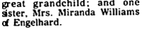ENGELHARD - Julia Weston MORRIS, 94, died February 10 in Pungo District Hospital in Belhaven. A native of Hyde County, she was born October 18, 1904. She was a resident of Engelhard and was employed in seafood processing as a crab picker. Survivors include one daughter, Beadie Terrell of Hollis N.Y.; and one son, Hollie Collins of Brooklyn, N.Y; 23 grandchildren, 22 great-grandchildren and 21 great-great-grandchildren. Funeral services were held Monday in Pleasant Grove Baptist Church with the Rev. Robert Byrd officiating. Burial was in Brown Memorial Cemetery. Rowsom Funeral Home in Columbia was in charge. (The Coastland Times - Tuesday, February 16, 1999; pg. 14A)