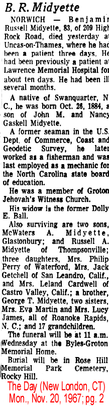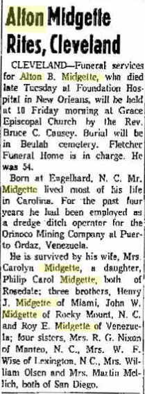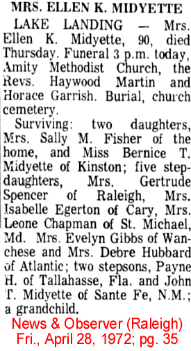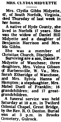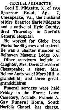 Edward B. Midgett, Hyde Native Dies - FAIRFIELD - Edward Blackwell Midgett, age 59, of Virginia beach, Va., died Monday at his home. Funeral services will be held Wednesday at 2 p.m. at the Pleasant Grove Church of Christ conducted by the Rev. Leon Williams. Burial will be in the Spencer family cemetery. Mr. Midgett was the son of the late Maryland Gibbs and Charlie Midgett of Beaufort County. Survivors include his wife, Mrs. Bessie Mae Chauncey Midgett; two daughters: Mrs. Thomas Daniels of Virginia Beach and Mrs. Edward Sadler of Chesapeake, Va.; five sons: Charles Midgett of Chesapeake, Willie G. Midgett of Norfolk, Va., and Jerry W., Robert Ervin and Johnnie L. Midgett, all of Virginia Beach; one step-daughter, Mrs. E.T. Conney of Norfolk, Va.; and four step-sons: Ollie R. Padgett of Greenville, Joseph Padgett of Hopeville, Va. and Alexander Padgett and Roger G. Padgett, both of Norfolk, Va.; three sisters: Mrs. Alice Cooke and Mrs. Alviues Foreman of Elizabeth City and Mrs. Nathan Berry of Alliance; and two brothers: William Midgett of Elizabeth City and Woodrow Spencer of Fairfield. (Washington Daily News - Tuesday, March 31, 1964)