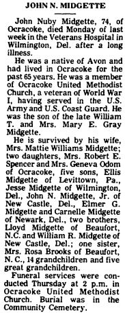 Jesse J. Midgette, 73, of Ocracoke, died Tuesday at his home. He was the brother of Carnelle F. Midgette of Beaufort. His funeral will be at 1 p.m. Thursday at Ocracoke United Methodist Church with the Rev. William Holmes officiating. Burial will follow in Ocracoke Community Cemetery. Mr. Midgette was a tugboat captain for 30 years with the US Army Corps of Engineers of Philadelphia, Pa. He was a Master Mason of the Washington Lodge of Wilmington, Del., and a member of the Scottish Rite of Wilmington, Del. He is survived by two sisters: Geneva M. Odom and Joyce M. Spencer, both of Ocracoke; and three additional brothers: Ellis T. Midgette of Levittown, Pa., John N. Midgette of New Castle, Del., and Elmer G. Midgette of Newark, Del. Arrangements are by Munden Funeral Home and Crematory, Inc. of Morehead City. (The News-Times - Wednesday, December 6, 2000)