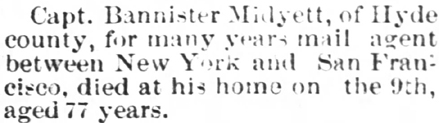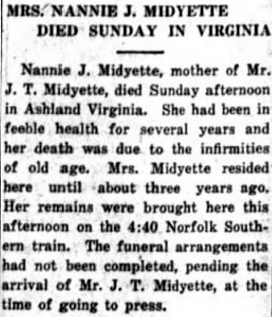 RICHMOND, VA. - A man who began life in Gulrock in Hyde County and rose to prominence in the seaboard railroad system, died Saturday at his home in Richmond. Harry J. MIDGETT, 62, grew up in Belhaven and moved to Richmond in 1958. His first wife was the late Blanche Wescott of Manteo. Several years ago he married Mrs. Cora H. Bundy of Belhaven who survives him. He is also survived by Mrs. Ludie Midgett, 93, distinguished resident and oldest citizen of Belhaven. His father was the late William B. Midgett. Also surviving are two daughters: Mrs. Browyne Morrisette of Richmond, and Mrs. J.P. Jones of Parsippany, New Jersey; two sisters: Mrs. C.C. Duke of Washington, and Mrs. M.L. Andrews of Belhaven; one brother, C.H. Midgett of Norfolk, Va.; and 3 grandchildren. Burial was at the Forest Lawn Cemetery in Norfolk. (The Coastland Times - Friday, September 2, 1960)