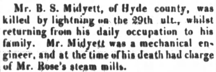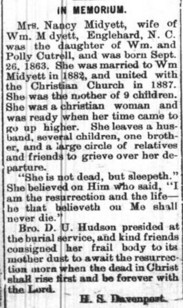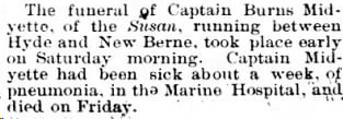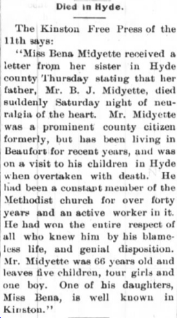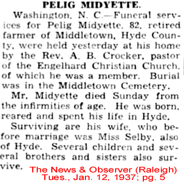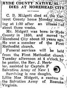ENGELHARD - Funeral services for W. Richard MIDGETT, 89, prominent citizen of Engelhard in Hyde County, who died at his home Monday night after a short illness, were conducted Wednesday at noon and interment was in the Fulford Cemetery. He was a member of the Christian Church and was a life-long resident of Hyde County, the son of the late John and Mrs. Midgett. He is survived by a daughter, Mrs. C. Lee Gibbs of Engelhard; a son, Charlie Midgett of Washington; a sister, Mrs. Mollie Sadler of Lake Landing. He was a well-known and highly respected citizen. The Berry Company were the funeral directors. (The Coastland Times - Friday, February 13, 1953; pg. 1)