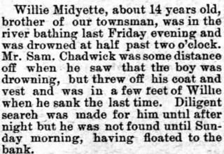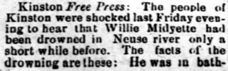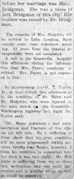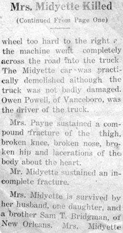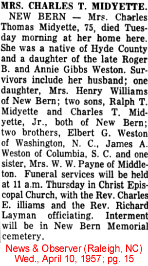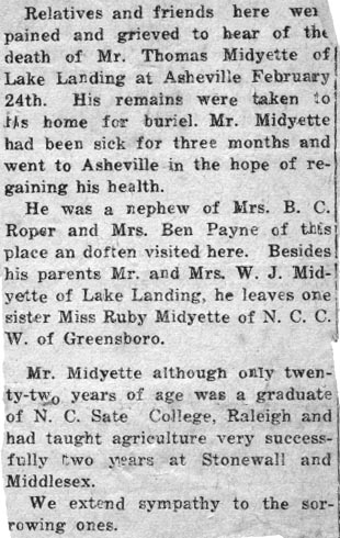 SERVICES HELD FRIDAY FOR LESLIE MIDGETTE - The body of Leslie MIDGETTE, 38, was taken to Columbia last Thursday for funeral services which were conducted in Hyde County last Friday afternoon at 2 o'clock. Mr. Midgette died at a Norfolk hospital Wednesday morning after an illness of three weeks. He was a Hyde County native but had lived in Tyrrell County most of his life. For the last five months of his life he had lived in Norfolk. He was a member of the Engelhard Methodist Church. He had been employed in Norfolk by the Norfolk Shipbuilding and Drydock Company. Leslie Midgette was the son of Mrs. Lula Mae Midgette and the late Riley Murray Midgette. Surviving are his wife, Mrs. Gladys Midgette; a sister, Mrs. Mary Swindell; and a brother, Beamon Midgette, both of Engelhard. (The Coastland Times - June 1, 1951; pg. 5)