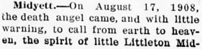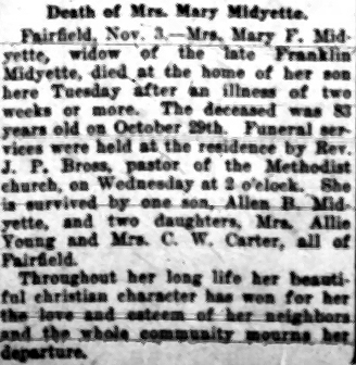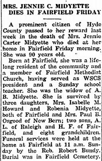 KILKENNY NATIVE DIES NEAR FAIRFIELD SUNDAY - Funeral services were conducted Sunday at the old home in Kilkenny, Tyrrell County, for Mrs. Emily Cartwright MIDGETT, 35, wife of John Midgett of the North Lake section of Hyde County. She died Sunday morning following the birth of a nine-pound daughter which with 3 other children survive her. She was the daughter of the late Mr. & Mrs. Stephen Cartwright of Kilkenny. Funeral services were conducted by Rev. W.P. Armstrong, Christian minister of the North Lake section. Berry Company of Swan Quarter were funeral directors. (The Coastland Times - Friday, March 23, 1951; pg. 8)