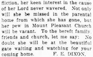 But at length after she had been sufficiently tried, the blessed Spirit of life, light and love, vivfyingly, cherishingly hovered over her poor soul, and there was life and light. Presently the glorious star of hope leaped into space, that is in the firmament of the gospel heavens, and she found a balm in Gilead, a healing physician there, and she was gloriously reconciled unto her God. On Saturday before the 4th Sunday in July 1893, she went before the church at Goose Creek Isle and related the wonderful dealings of the Lord with her poor soul, and how that He had given her a good hope through grace to trust in the merits of the crucified Redeemer. She was unanimously received and baptized on Sunday following by Elder J. R. Rowe. About date of 1907 they moved to Beaufort county, her membership however, remained with the church at Goose Creek till her decease, which occurred May 15th, 1917, making her sojourn in this sin cursed world 62 years, 5 months and 23 days. The King of terrors, and terror to kings, that last, that potent enemy, that relentless tyrant, who being armed by man's rebellion, and the strength of a violatel law had been roaming in every country, and the earth and sea, a stranger to pity, a foe to sympathy, and human kindness, with his scythe he has laid the earthly race like the mowers withering grass, and all the glory of man has fallen before his triumphant march. This dreadful enemy therefore, having no respect for neither age nor sex, high or low, king or peasant, master or slave, invaded the earthly mansion house of this tried and afflicted saint of God, and it tottered and fell. It was the sad privilege of the writer to be near her bedside, although absorbed in deep sympathy and anxiety, and see the final dissolution of her earthly tabernacle, the silver cord slipped loose without a sound. At the age of 62 years her frame was overcome by the burden of increasing infirmities. The machine was worn out, it had done its appointed work and was done. I looked upon the face of that clay, calm and tranquil in death, with not one muscle distorted, and as I beheld I saw stamped upon her clay the impress of the light of heaven, leaving the features placid and beautiful in death. In the midst of that miserable gloom I thought of the retinue of that throng of majestic Seraphims (ministering Spirits) waiting in silent and solemn grandeur to escort her immortal spirit into the benign presence of the Deity, and an innumerable company of angels to enjoy the beatitude of heavenly bliss for evermore.