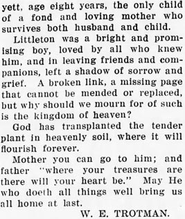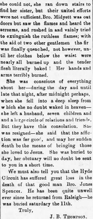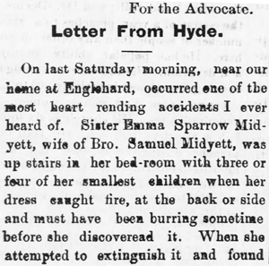 Dear reader, permit me to state just here; as I have omitted this item of the narrative, that this was the beginning of her dissolution. She yielded to her weakness and was overcome with grief that her health gave way, and she continued to sink down little by little, finally becoming despondent and a complication of diseases set in, and her physical strength continued to decrease. She sustained her bitter afflictions with a great degree of Christian fortitude, never murmuring or complaining, but seeming to be entirely resigned to the will of God. She expressed a willingness to die, that the sting of death was all that she dreaded, and that she was loath to go and leave her husband and children behind. All was done for her that loving hands could do, but the grim monster death could not be bribed to friendship or compromise thereby, or touched with pity. On May 16th her cold and lifeless, form was conveyed from her home to the cemetery on the north side of Pamlico River, and after the funeral service by Elder D.W. Topping to a large assembly of sympathizing friends, her clay was laid to rest by the side of her son, C. J. Moreslender to await there in the awful solitude and gloom of the grave, with not a sound to break the silence which is mysteriously sublime, and the gloom deep and broad. Then 0 rapturous that the piercing eye of omniscience looks down from heaven and watches over her sleeping dust, not one atom will stray beyond the broad range of his gaze, until that silence shall have been broken by the tomb rending shout of the Lion of the tribe of Judah. Then she shall awake in his likeness, that corruption shall put on incorruption and that mortal shall put on immortality. Then shall be brought to pass the saying that is written, "death is swallowed up in victory." That relentless foe shall be forever destroyed under his feet, and that soul stirring acclamation heralded by all the victorious throng. Great and marvelous are thy works Lord God Almighty, just and true are thy ways, thou King of saints. [signed] T.R. Sawyer.