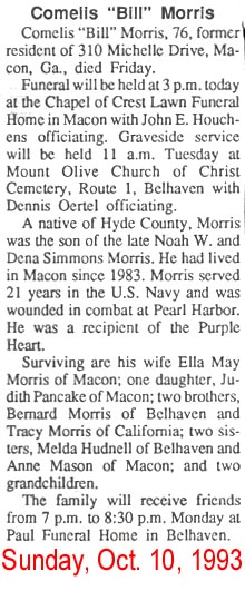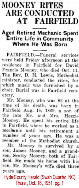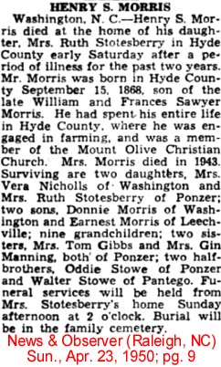 PONZER - Funeral services for David W. MORRIS, highly respected Ponzer resident, were conducted Monday at 3 p.m. at the Mt. Olive Church of Christ at Ponzer by the pastor, James E. Gibbons. Interment was in the church cemetery. Mr. Morris, 68, passed away unexpectedly at his home Sunday morning at 6 a.m. of a heart attack. His wife, Mrs. Winifred Dunn Morris preceded him in death on June 26th of this year. Survivors are one son, Carlton Morris of Gatesville; three daughters: Mrs. Beverly Rice of Bridgeton, Mrs. A.T. Foreman of Ponzer, and Mrs. H.L. Brown of Gates; 7 grandchildren; one brother, Lewis Morris of Wilson; one sister, Mrs. John Rice of Lowland; and one half-brother, Bonner Morris of the U.S.A.F. (The Coastland Times - Friday, November 26, 1954; pg. 8)