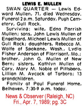 Trinity United Methodist Chruch, the WSCS and UDC. Survivors include another son, Howard W. Muir of Martinsville; three daughters, Mrs. T. Paul Davis and Mrs. W. H. Gatson of Newport News and Mrs. J. R. Burroughs of Dawn; a sister, Mrs. Agness McGhee of Asheville, N. C.; nine grandchildren and two great grandchildren. The family will receive friends from 5 to 7 p.m. today at Peninsula Funeral Home. The body will be sent from Peninsula Funeral Home to Paul’s Funeral Home, Belhaven, N. C. for funeral and burial. (Daily Press, Newport News, Virginia - November 5, 1972) Researched & submitted by Linda Mayo who offers this information --(Full name: Blanche Mary Jarvis; born August 20, 1883; father: Thomas Rodman Jarvis; mother: Lucy Neal Selby; husband: Oscar Fenton Muir)MULLEN, Lewis Edward