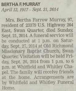 Funeral was at Old Richmond Missionary Baptist Church in Swan Quarter, NC on Friday, June 23, 1978 at 2p.m.