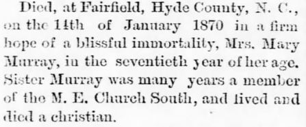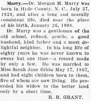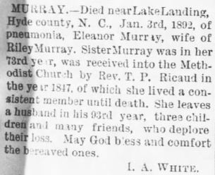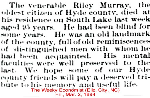 Also The Washington Progress Weekly, Tuesday, Feb. 27, 1894; pg. 4 ran this obituary: DIED - Mr. Riley Murray, the oldest man in Hyde County, died at his home near Lake Landing on February 13th [tombstone says 14th]. He was born in May 1799 and was in the 95th year of his age. He leaves a son, Dr. M.M. [Morgnn Monroe] Murray, and three daughters: Sue C. [Clay] Watson wife of G.I. [George Israel] Watson, Eugenia Saunderson wife of Benjamin Saunderson, and Lizzie Mann wife of Dr. Joseph Mann.