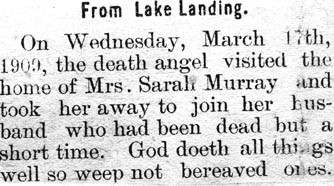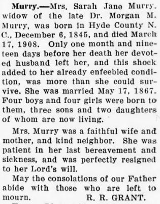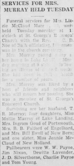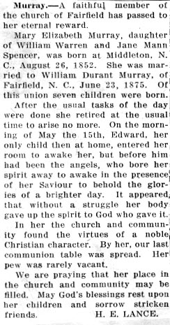 Edward Napoleon MURRAY, 67, died Monday, December 22, at his home in Fairfield, Hyde County. He was a member of the Methodist Church, attended State College, and was a farmer all of his life. He was the son of the late William Durant Murray and Elizabeth Spencer Murray. He is survived by his wife, Ella Selby Murray; a daughter, Mrs. Elizabeth Murray Cooper of Windsor, N.C.; and two grandsons: Jerry Ward of the U.S. Air Force and Murray Ward, a student at the University of North Carolina. Funeral services were held Wednesday, December 24, at the Methodist Church at 11:00 with interment at Fairfield Cemetery. (The Coastland Times - Friday, January 9, 1959; pg. 5)