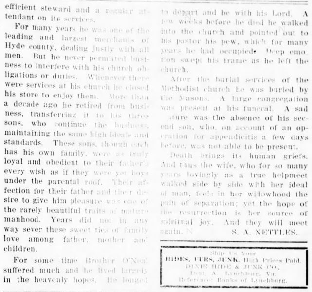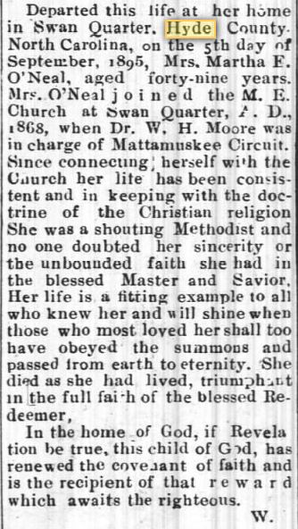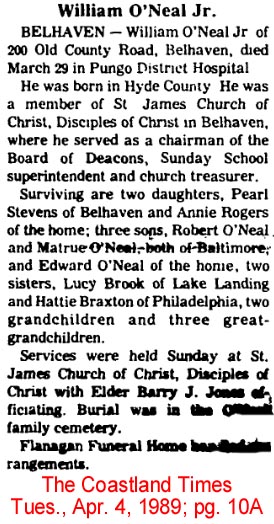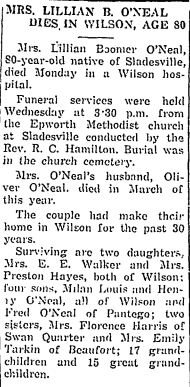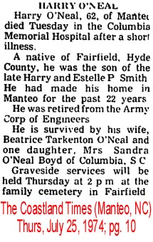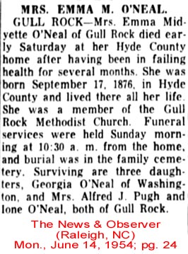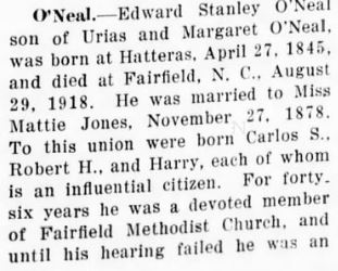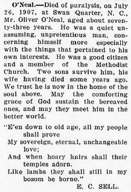 ENGELHARD NATIVE DIES IN WASHINGTON - Samuel O'NEAL, 82, native of Hyde County, died Friday afternoon at his home in Washington after an illness of two years. He was born in Hyde County January 29, 1872, son of the late Matthew and Mary Clark O'Neal. He was a retired farmer and fisherman and had moved from Engelhard to Washington. He was a member of the Engelhard Christian Church. He was married to the former Ellen Sadler of Hyde County who survives. Other survivors are one son, Will O'Neal of Washington; 10 grandchildren and 12 great-grandchildren; one sister, Mrs. Alice Sadler of Washington. Funeral services were held from the Washington Church of God on Saturday at 3 p.m., conducted by the pastor, Rev. S.W. Avery. Burial was in Oakdale Cemetery. (The Coastland Times - Friday, December 10, 1954; pg. 1)