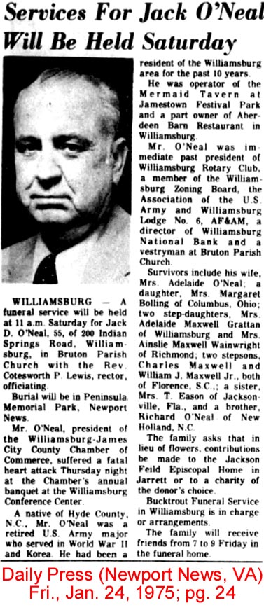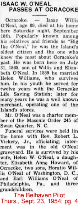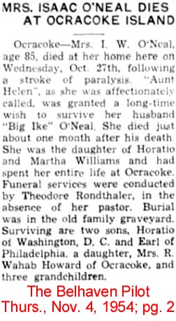 OCRACOKE, Nov. 3 - W.W. O'NEAL, age 75, native of Ocracoke, died at his home in Merchantville, N.J. on Satuday, November 1st, after a long illness. Funeral services will be held there. He is survived by his wife, May O'Neal; three sons: Willis, Robert and Linwood; and two daughters: Clara and Ruth. Here at Ocracoke he is survived by two sisters: Mrs. Elnora Ballance and Mrs. Tressie Howard; and two brothers: Capt. I.F. O'Neal and Capt. Walter C. O'Neal, Sr. Mr. O'Neal left Ocracoke when he was about 16 years of age and went North to the Philadelphia area where he was captain of a dredge for many years. Capt. and Mrs. Walter C. O'Neal, Sr. and Capt. I.F. O'Neal left here Sunday for Merchantville. Mr. and Mrs. Jesse Garrish and Mr. and Mrs. Elisha Esham, who received the news while visiting in Richmond, also planned to attend the funeral services. (The Coastland Times - Friday, November 7, 1958; pg. 7)