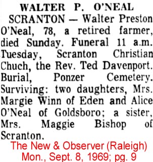OCRACOKE - Walter Cleveland O'NEAL, SR., 91, the husband of Mrs. Armanda Garrish O'Neal and a retired fishing and hunting guide, died Wednesday night at his home. A native of Ocracoke, he was a member of Ocracoke United Methodist Church. Other survivors include a daughter, Mrs. Louie Dell O'Neal Williams of Ocracoke; two sons: Van Henry O'Neal of Ocracoke and Walter C. O'Neal, Jr. of Las Vegas, Nevada; 6 grandchildren and 6 great-grandchildren. A funeral will be held Saturday at 2 p.m. in Ocracoke United Methodist Church by the Rev. Jimmy Creech. Burial will be in the family cemetery with Twiford Island Chapel in Hatteras in charge. (Daily Advance - December 31, 1977)