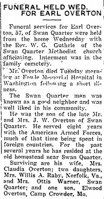 Elsie Shillingford Overton, 85, died in Greenville, South Carolina on Monday, December 11, 2006. Mrs. Overton was the widow of Charles Nathaniel (Nat) Overton formerly of Swan Quarter who died in 1974. She opened her home to more than 200 foster children, was a selfless person and for many years provided dinners at Thanksgiving, Christmas and Easter to the less fortunate. She was the founder of “People Helping People” and a Jefferson Award recipient in Greenville, S.C. A graveside burial service will be held at 11:00 a.m. Friday at Soule Cemetery. Steve Bryan, Lay Speaker will officiate. Surviving are a daughter, Norma Jean Dillard; a brother, Donald Shillingford of Woodberry, N.J., two grandchildren, Chris Bench and Ryan Bench. She was preceded in death by a son, Edward Overton. Arrangements are by Bryan Funeral Service, Swan Quarter. (Bryan Funeral Service obituary posted in January 2006)