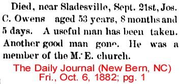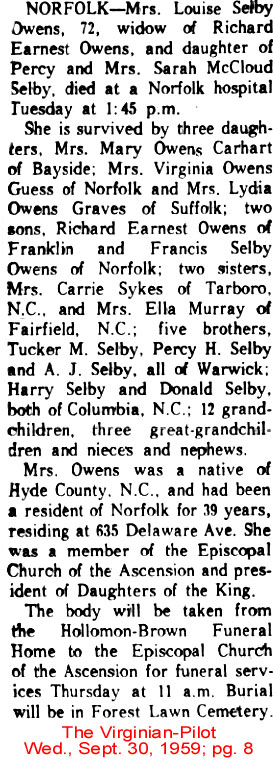 CURRITUCK NATIVE DIES IN NORFOLK - Joseph B. OWENS, age 67, resident of Washington, N.C., died in the Marine hospital in Norfolk on July 16 following a critical illness of several days. He had been in failing health for the past year. Mr. Owens was born in Currituck County December 16, 1891, son of the late Jordan and Penelope Owens. He was a retired Coast Guardsman and had been living in Washington since 1945. He was married to the former Della Dunbar of Hyde County who survives. Other survivors are one son, Marvin Owens, warrant officer in the U.S. Army at Fort Campbell, Ky.; two step-sons: Joseph and John Liverman, both of Baltimore, Md.; one step-daughter, Mrs. Malcolm S. Simmons of Belhaven; 3 grandchildren and 5 step-grandchildren; and two sisters (not named). Funeral services were held at the chapel of the Paul Funeral Home in Washington on Sunday afternoon at 2 o'clock with the Rev. Earle J. Rogers, pastor of the First Baptist Church, officiating. Burial was in Oakdale Cemetery. Nephews served as pallbearers. (The Coastland Times - July 24, 1959)