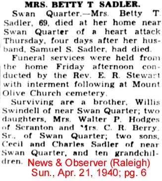 Gaston Bell Sadler, 89, of 5491 U. S. Highway 264, Scranton died at home on Wednesday, December 16, 2009, going to be with his Lord and family including Essie Equils Sadler, his wife of 66 years, a son, Thomas Deree, his granddaughter, Heather and son-in-law, Wilson Lumsden, and his parents, Charlie R. and Sudie Pearl Harris Sadler, and Brothers, Mack Deree Sadler and Lindsey Warren Sadler and sister, Kathleen McKinney. He is survived by his daughters, Audrey Dianne Lumsden of the home and Dorinda Guzzo and husband, Michael of Cape Coral, FL; two brothers, Robert Sadler and wife, Millie of Marlboro, NY and Travis Sadler and wife, Christine of Washington; two sisters, Hazel Worthman of Washington and Lucille Jones of Engelhard; numerous nieces and nephews and great-nieces and nephews; a brother-in-law, William Equils and wife, Dot of Washington; two sisters-in-law, Edna Equils of Cross Creek Health Care in Swan Quarter and Henrietta Equils of Richmond, VA. He was a member of Scranton Christian Church and an avid commercial fisherman. Funeral Services will be at 2:00 p.m. Sunday at Scranton Christian Church. David W. Mason and Mike Swindell will officiate. Burial will follow in Mt. Olive Church of Christ Cemetery at Ponzer. The family will receive friends on Saturday, 6:30 p.m. to 8:00 p.m. at Bryan Funeral Service in Swan Quarter. (Washington Daily News [Washington, NC] – Friday, December 18, 2009)