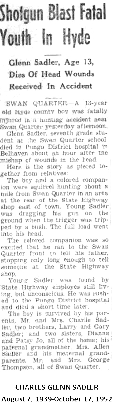 SWAN QUARTER - Charlie Eugene SADLER, 27, died Wednesday, October 14, 1998. Born in Glynn County, Georgia November 17, 1970, he was the son of Garry Wayne and Lynn Jennette Sadler. He worked as a commercial fisherman. Charlie joined the Swan Quarter Baptist Church in September of this year and was baptized at that time. Funeral services were held Friday at the gravesite in the family plot at Soule Cemetery. Steve Bryan officiated. Surviving in addition to his parents are his paternal grandmother, Hazel T. Sadler, and his two brothers, Vernon T. Sadler and Eric W. Sadler, all of Swan Quarter. Arrangements were by Bryan Funeral Service in Swan Quarter. (The Coastland Times - Sunday, October 18, 1998; pg. 10A)