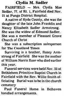 SWAN QUARTER - Caddie Smith SADLER, 75, died December 30 in Pungo District Hospital, Belhaven. Mrs. Sadler, a native of Leechville, was the daughter of the late Pilos and Sudie Keefer Smith. She worked for many years as a seamstress with the former Belhaven Manufacturing Company. Survivors include a son, Delmer M. Sadler of Swan Quarter; five daughters: Sybil S. Gibbs of Swan Quarter; Ellen S. Wood, Mae S. Ambrose and Jane S. Chesson, all of Plymouth; and Brenda S. Roper of Scranton; a sister, Lillian Henries of Washington; 11 grandchildren and six great-grandchildren. A funeral service was held January 2 at 3 p.m. at the gravesite in Soule Cemetery. The Rev. Lynn Manilla, pastor of Calvary Presbyterian Church, officiated. Bryan Funeral Service, Swan Quarter, handled arrangements. (The Coastland Times - Tuesday, January 4, 1994)