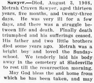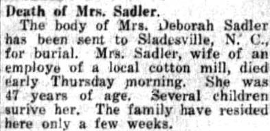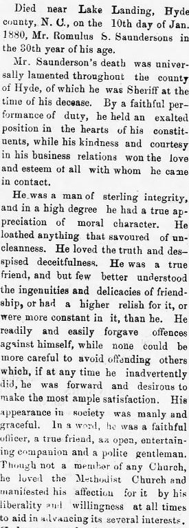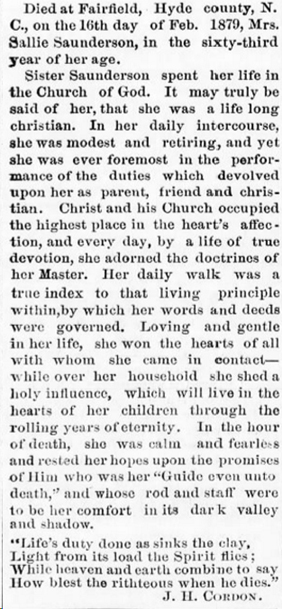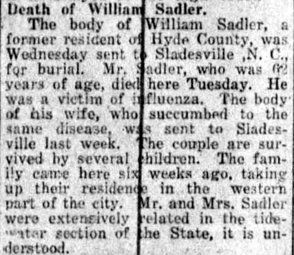 RESOLUTION OF RESPECT - Whereas, our heavenly Father in his infinite wisdom on January 10, 1906, saw fit to remove from us our brother, Samuel B. SADLER, from a life of suffering, to eternal glory in his home above. He was a fine business man, one whom the public often sought for good advice. He was a member of Fairfield Lodge #520 AF & AM. We extend our heartfelt sympathy to the bereaved wife, loving children, and relatives. (The Daily Economist (Elizabeth City) - Wednesday, February 14, 1906)