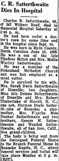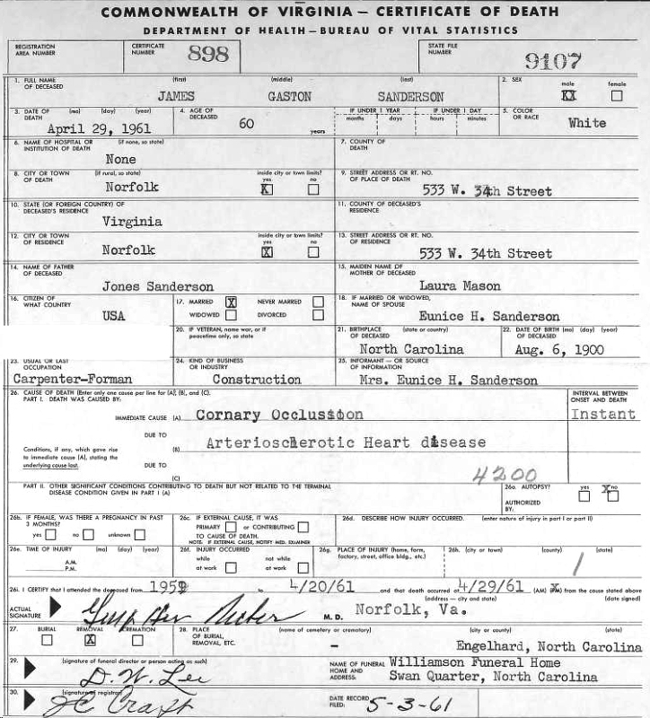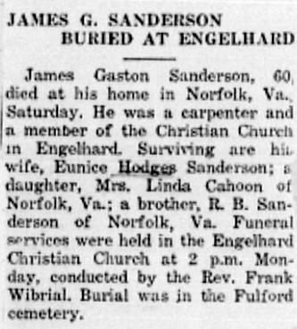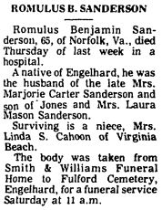 SCRANTON - John B. Sadler, 67, died Wednesday. He was a veteran of World War I and was retired from the Navy yard in Norfolk. Surviving are his wife, Mrs. Emily Mason Sadler; one son, John Stanton Sadler of Washington, N.C.; one daughter, Mrs. M. R. Phillips of Norfolk, Va.; and four grandchildren. Funeral services will be conducted Friday at 3 p.m. at Eunice Chapel Church by Rev. Walker Perry. Burial will be in the family cemetery. (The News and Observer, Raleigh, NC - Thursday, May 3, 1962, pg. 12)
