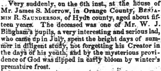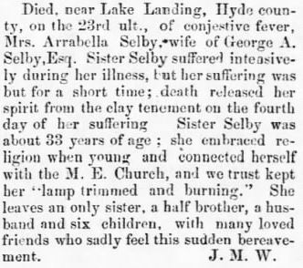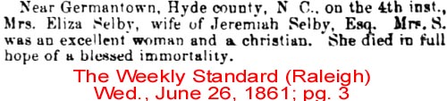 Died Wednesday morning, Henry SELBY, late of Hyde County, in the 27th year of his age, of inflammation of the brain. (American Recorder - Friday, May 2, 1823; pg. 3; column 2) [Posted here with kind permission from John H. Oden, III]
