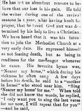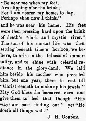 It becomes my duty to write a few lines in loving memory of our loving brother. He was born March 16, 1830, died May 23, 1917, making his stay on earth 87 years, 2 months and 7 days. Oh I do feel so unworthy to write about such a dear one, he was so much my superior but I want to be ready and willing to obey. He united with the Primitive Baptist Church on Saturday before the 3rd Sunday in July 1873, and was baptized by Elder Albert Cartright the following Sunday morning. Shortly the church saw the marks of a deacon and he was chosen and ordained and proved to be faithful to the end, always contending for peace. [the rest of this lengthy obit is cut off] (Zion's Landmark - August 1, 1917; pg. 426-427)