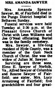 SCRANTON - Alice Virginia Sawyer Sadler, 90, formerly of the Scranton Community, and more recently a resident of Cross Creek Health Care Center, died February 13, 2008 at Cross Creek. Born in Hyde County, March 7, 1917, she was the daughter of the late Becton and Aileen Pegram Sawyer. She was married to Ellis Dalton Sadler who preceded her in death. She was a member of Rose Bay Baptist Church. Funeral Services will be held at 2 p.m. Friday at Rose Bay Baptist Church. Steve Bryan and Sam Eburn, Jr. will officiate. Burial will follow in Soule Cemetery. Serving as pallbearers will be C. D. Gibbs, Dewey Sawyer, Larry Phelps, Paul Cohn, Lee Williams, Barry Equils and Steve Sawyer. Honorary Pallbearers will be Jerry Sawyer and Wayne Sawyer. Surviving are two daughters, Dorothy S. Equils and Faye S. Gibbs both of Washington; a brother, Roger Sawyer of Plymouth; three sisters, Doris Phelps of Manteo, Nell Lee of Richlands and Hilda O’Neal of Fairfield; five grandchildren; fifteen great-grandchildren and eleven great-great grandchildren. The family will receive friends at the home of Mrs. Sadler’s grandson Mr. Barry and Sherry Equils 1581 New Lands Rd., Fairfield. Arrangements are by Bryan Funeral Service. (The Coastland Times - Sunday, February 17, 2008; pg. 10A)