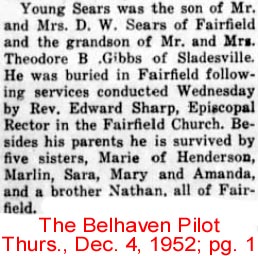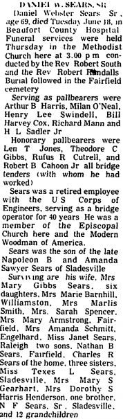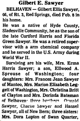 SWAN QUARTER - Aubrey Christopher SEWELL, 79, died Saturday, October 9 at Beaufort County Hospital in Washington. Born in Lake Landing, Hyde County on August 25, 1925, he was the son of the late George W. and Lydia Gibbs Sewell. He served in the U.S. Army during World War II and was captured in the Battle of the Bulge, however, he was able to escape before being declared a prisoner and attained the rank of Staff Sergeant. Following military service, he worked as a tester in oil fields in Alaska, Beirut and other locations around the world. In the mid-1970's he returned to Hyde County and later owned and operated Land's End Seafood. He retired in 1999 following Hurricane Floyd's damage to his business. Surviving are 6 sisters: Edna Powell and Elizabeth Bell, both of Smithfield, Va., Lida Mae Stapleton of Swan Quarter, Dixie Kienker of Maitland, Fla., Glenda Turner of Lagrange, Ga. and Lois Schipansky of Davison, Michigan. A service to celebrate his life will be held at 2 p.m. Wednesday, October 13, at Bryan Funeral Service. Steve Bryan will officiate. Mr. Sewell was preceded in death by two brothers: Avery and Glenn Sewell. Arrangements by Bryan Funeral Service, Swan Quarter. (The Coastland Times - Tuesday, October 12, 2004; pg. 11A)