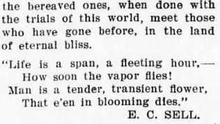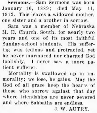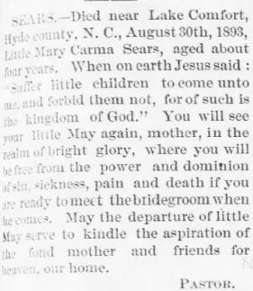 On November 3, 1907, the death angel visited the home of D.S. and Florida McGowan and took Elema Sermons. She had been a faithful worker on earth. She seemed to bear her sufferings patiently, and was ready, she said, to die, and meet her Savior in heaven, where there is no parting, sorrow, nor pain. She leaves one daughter to mourn her loss, but she is not like those who have no hope. We pray that God's wonderful blessings will rest upon the bereaved ones. Blessed are the dead who die in the Lord. /signed/ A.E.C. AND F.H.M." (Raleigh Christian Advocate - December 12, 1907) [Kindly submitted by Merlin Berry who states that he believes the authors of this obituary are Annie Ethel (McGowan) Cahoon and Florida Helen (Jarvis) McGowan.]